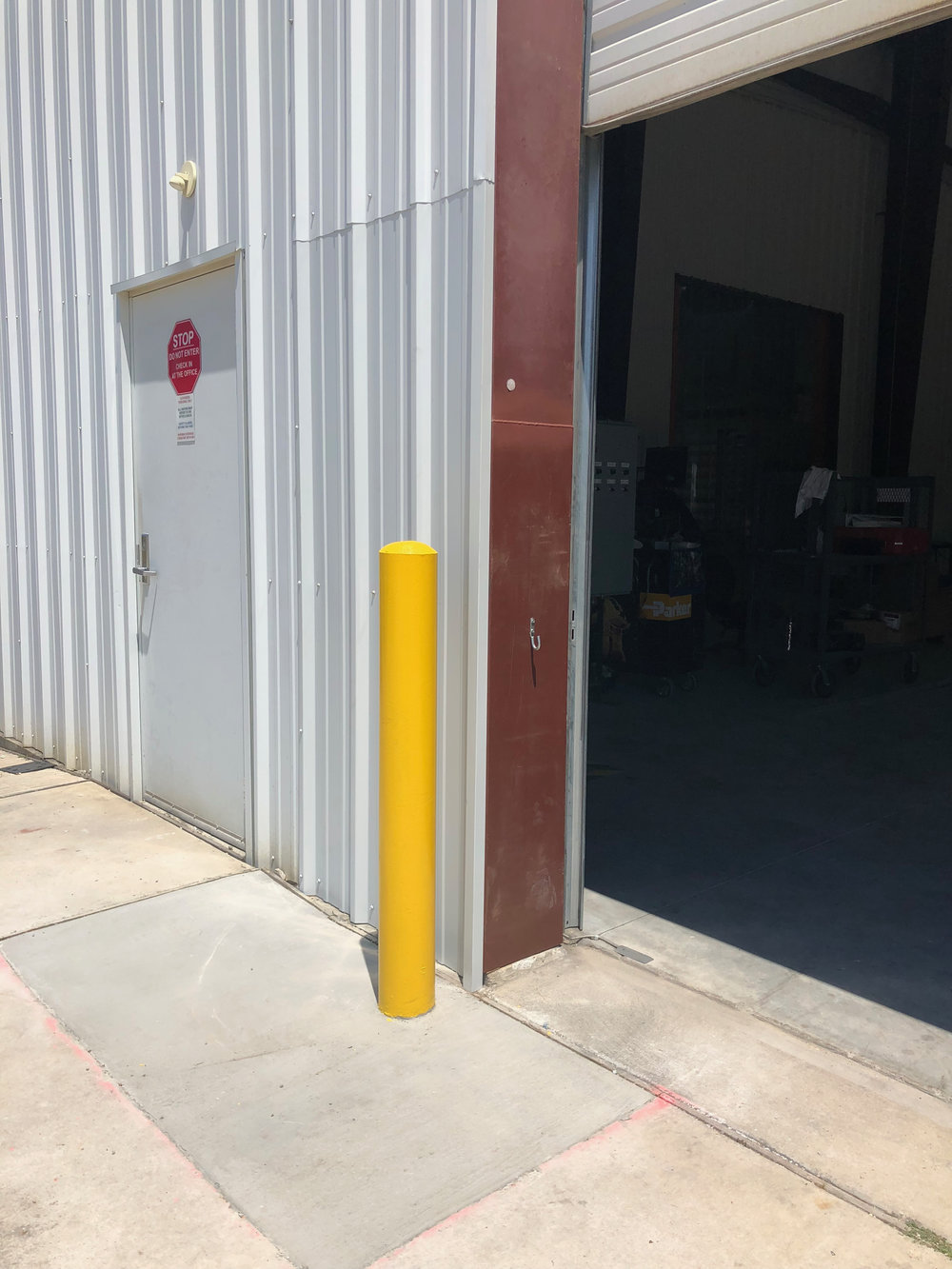 A truck damaged the bollard (and concrete base), the overhead door and wall panel. We replaced them all. This shows after the bollard and concrete repair, but before the steel repair. Our cement contractor repaired the cement.