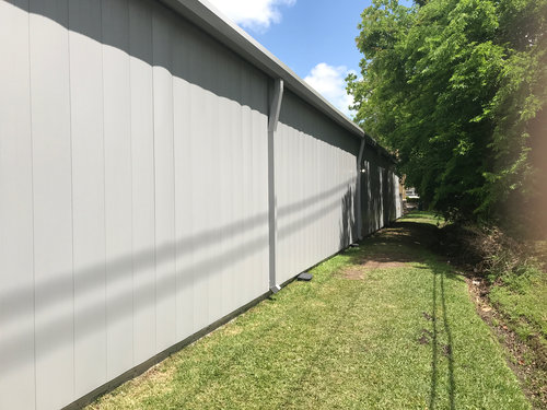 Metal wall panel replacement, before and after pictures. Wall panels replaced with modern color and panel profile. Insulation also replaced, new facing, upgraded R-value. We replaced the old gutters and downspouts with new also