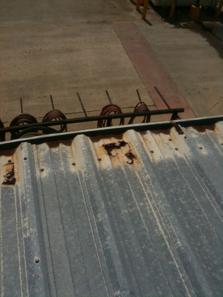 his metal building had rusted thru metal roof panels along the eave, along with other areas around the roof. This caused the metal roof to leak. Leaks along the edge, or eave, of a metal roof is extremely common. It is due to improper installation of closures at the eave between the bottom of the roof panel and the eave strut. As part of our repair process we follow Metalguard repair procedures that seals the metal roof eave to prevent this from happening in the future. The reason the metal roof panels rot out at the eave of the roof is because the metal building insulation gets wet. It stays wet ant rusts out the underside of the roof panel. All because of improper eave detail.