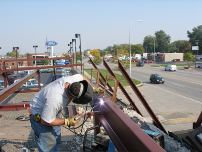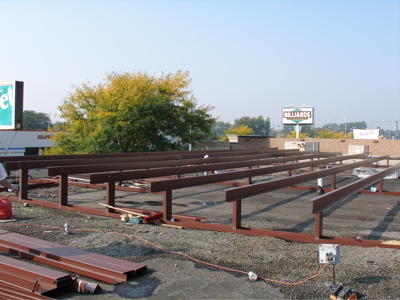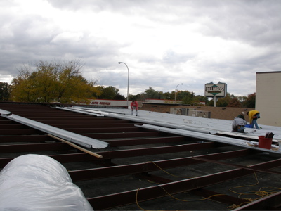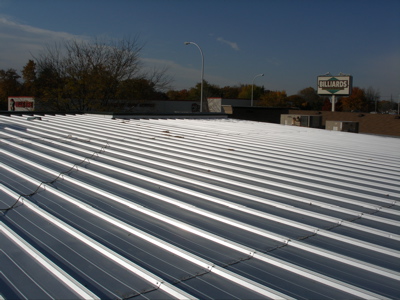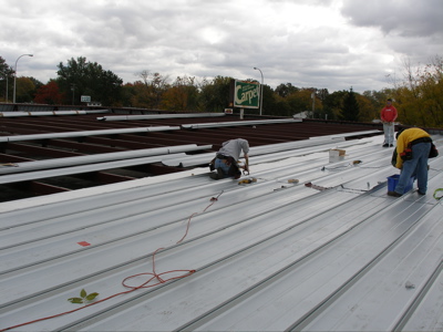 When installing a new sloped metal roof over an existing flat roof the support structure is installed over the top of the flat roof. When using a standing seam sloped metal roof the new roof pitch can be as low as 1/4:12. A standing seam roof is a hidden fastener system roof with no exposed fasteners. This new roof should last over 40 years. We are currently seeing roof from the 70's that are still in good shape, and the new galvanizing processes today are far superior to what was used back then